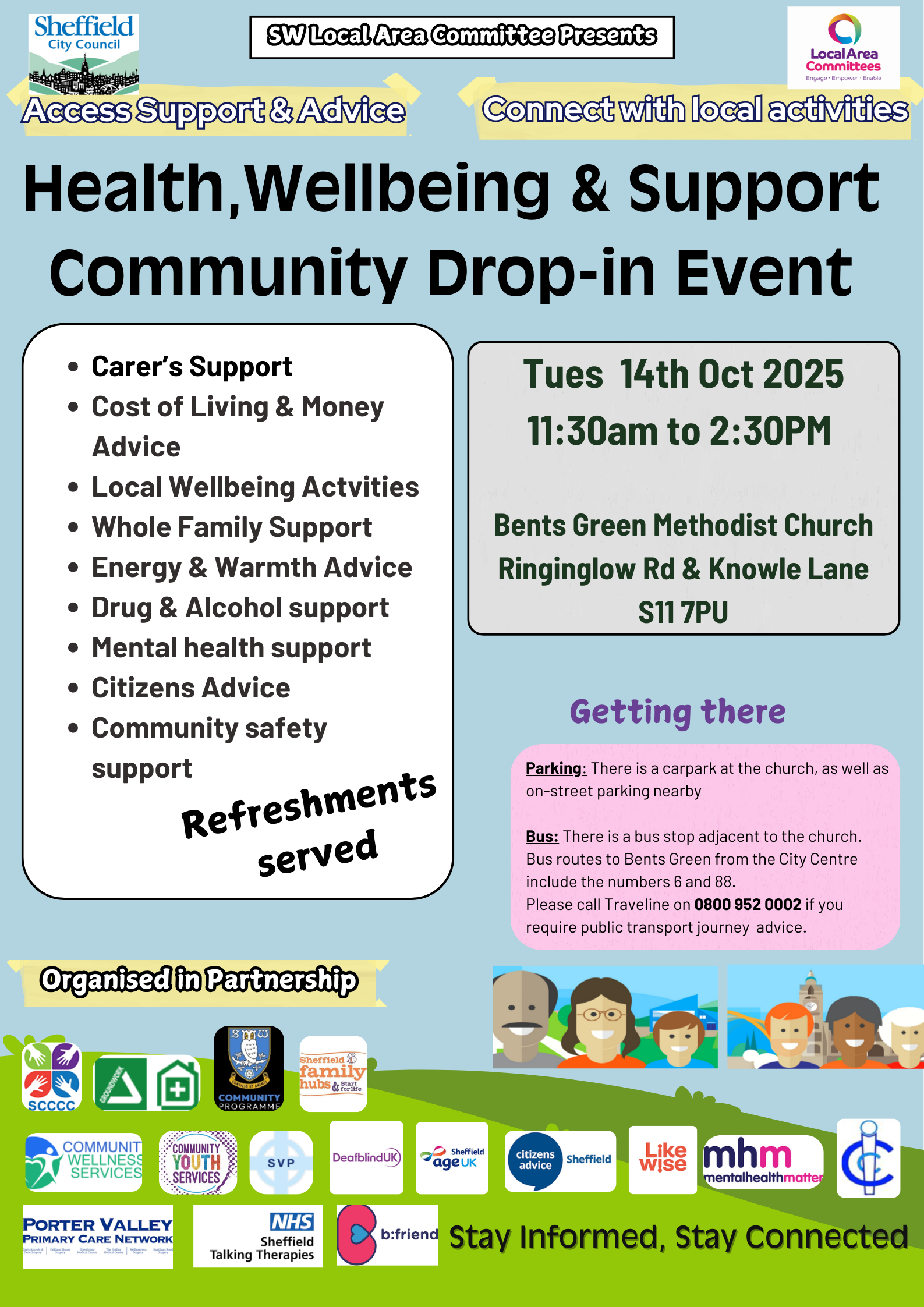 MORE DETAILSHealth, Wellbeing and support drop in at Bents Green Methodist Church S11 7PU attended by a range of support services. View Poster